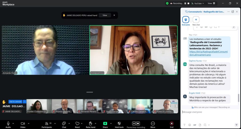 Este 4 de diciembre, la Fundación Ciudadana por un Consumo Responsable (FCCR) organizó el Conversatorio virtual para analizar el comportamiento de los reclamos de los consumidores, evento en el que participaron 45 especialistas de 10 naciones iberoamericanas (Argentina, Brasil, Colombia, Chile, Ecuador, El Salvador, España, Panamá, Perú y Uruguay).